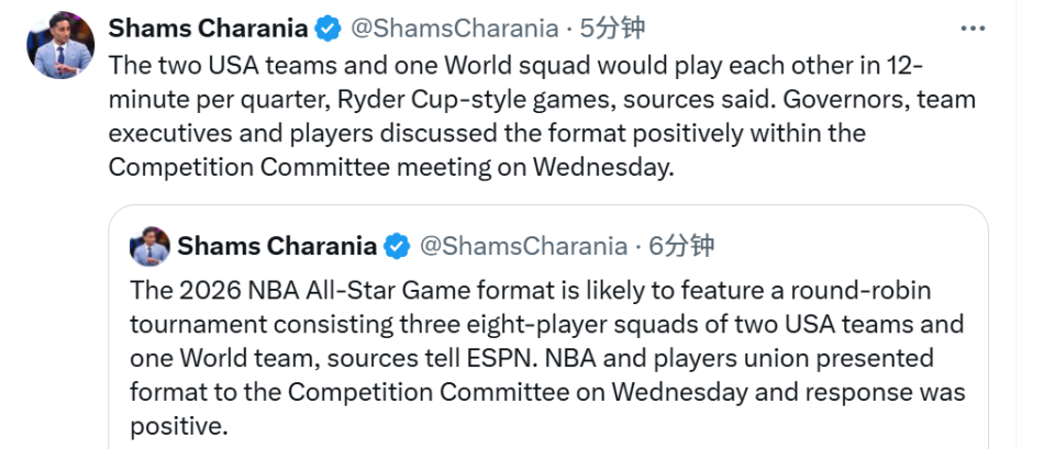 消息人士还表示,两支美国队和一支世界队将进行类似莱德杯赛制的比赛,每节比赛12分钟。球队老板、球队高管和球员在竞赛委员会会议上对该赛制进行了积极讨论。